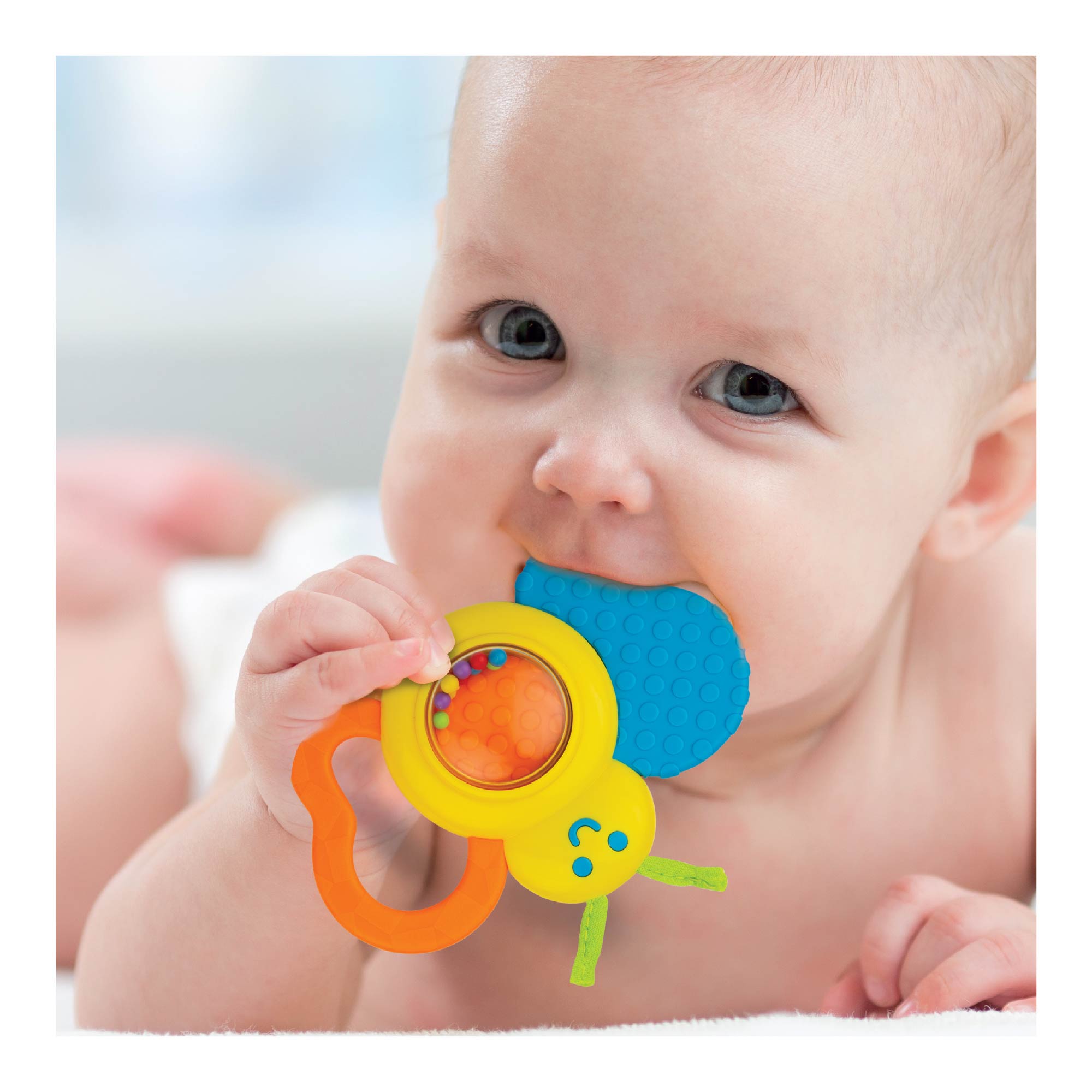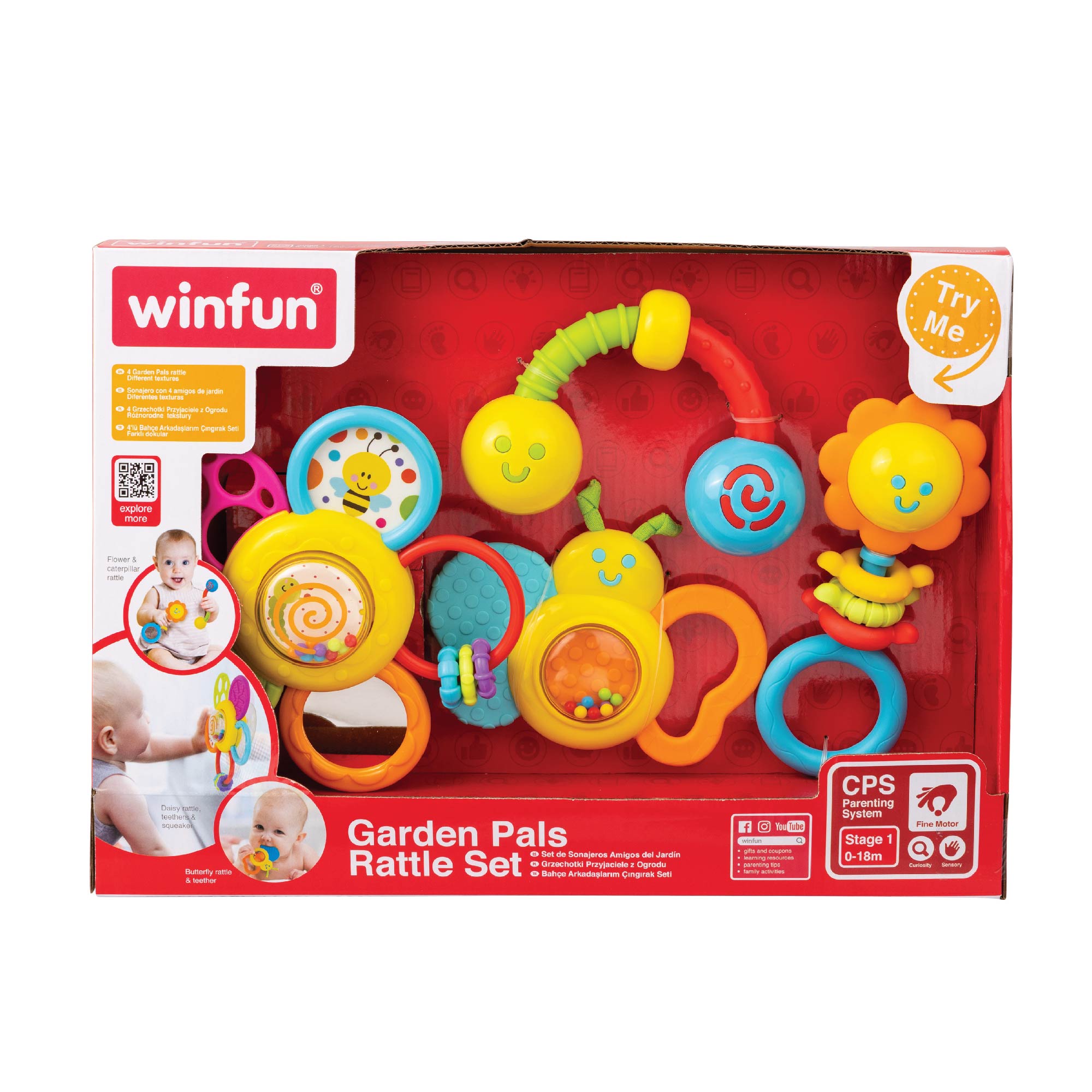Brighten a baby’s world with the Winfun Garden Pals Rattle Set! This colorful collection includes a flower rattle with spinning leaves, a twist-and-turn caterpillar, and a butterfly with textured wings and rattle beads for endless sensory fun. Each piece is designed to encourage tactile exploration and fine motor skills while introducing cheerful sounds and engaging textures. The daisy spin rattle adds extra excitement with a baby-safe mirror, squeaker, and soft teethers, making playtime both soothing and stimulating. Your gift helps bring joy and developmental play to children in need—because every child deserves a happy start!